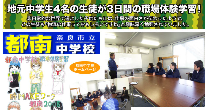 僕は職場体験で富士運輸へ行った。2日目は伊藤さんに会ってから僕たち2人の紹介とあいさつをした。富士運輸の社員の人たちはこころよく頑張ってくださいと言ってくださり、3日間がんばろうと思った。そして二階に荷物を置いてトラックのとまっている3ヶ所ほどを伊藤さんに案内してもらった。そして整備工場を見せていただいて工場長と整備の方の社員さんにあいさつをした。そこでもこころよくがんばれと言われた。そしてごはんを食べて10トントラックに乗って三重県のロート製薬に中尾さんと行った。初めて10トントラックに乗ってすごい視野が高いと思ってすごかった。そして奈良に帰ってきて社員の人にあいさつして帰った。